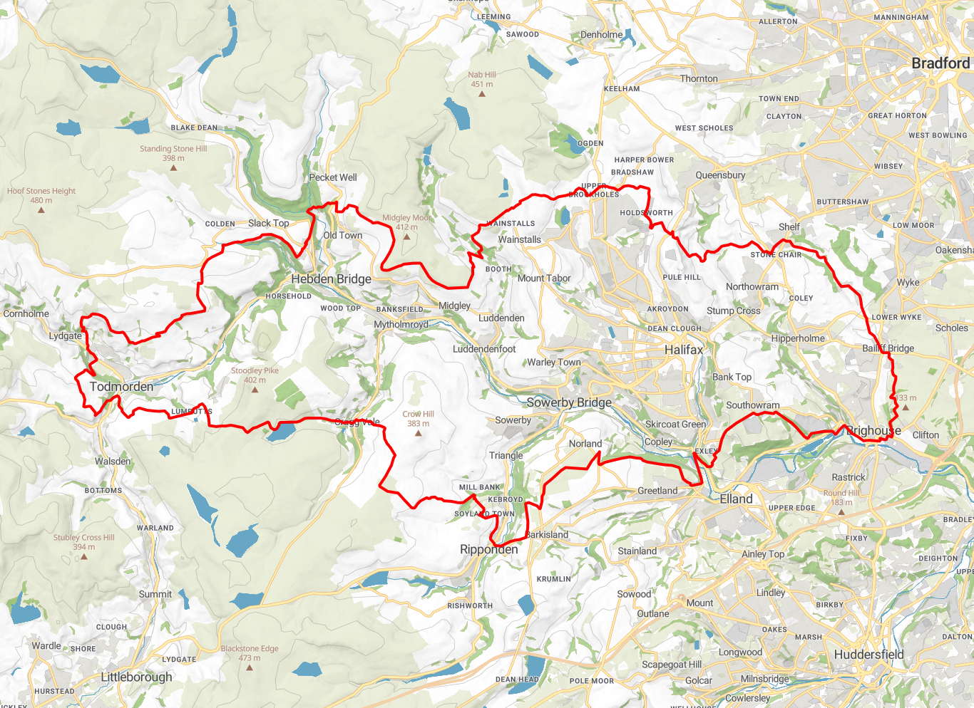 The Calderdale Way is a 50 mile circular walk around Calderdale. It climbs 2,600 metres with a climb rate of 43 metres per mile.